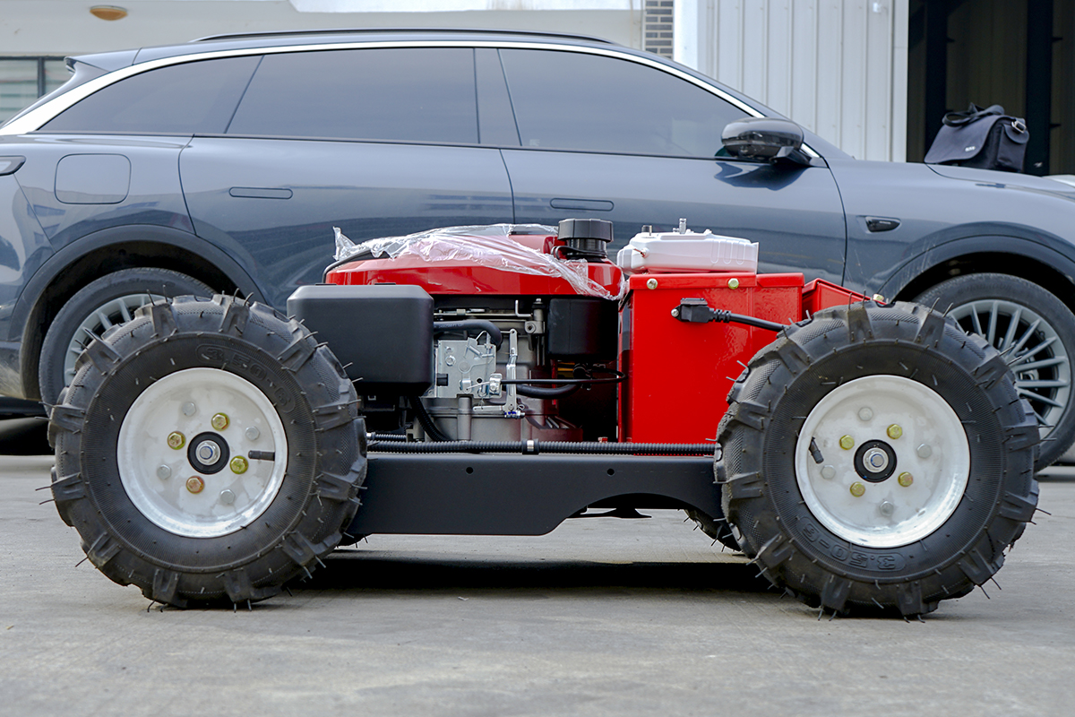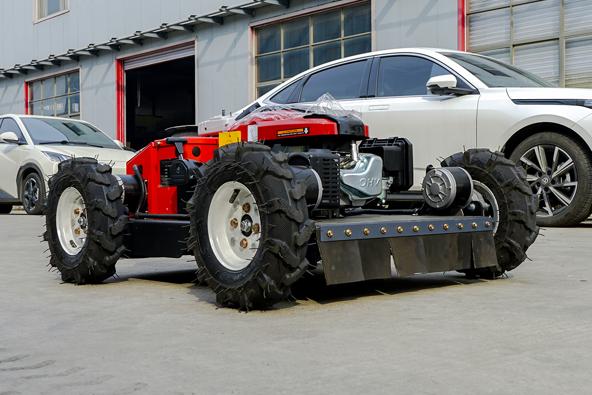 Four-wheel drive for stable operation and superior terrain adaptability: The four-wheel drive system delivers 50% greater traction than two-wheel drive, effortlessly tackling slopes up to 30° in gardens and orchards. It maintains stable performance on challenging surfaces like mud and gravel, preventing slippage and missed cuts.